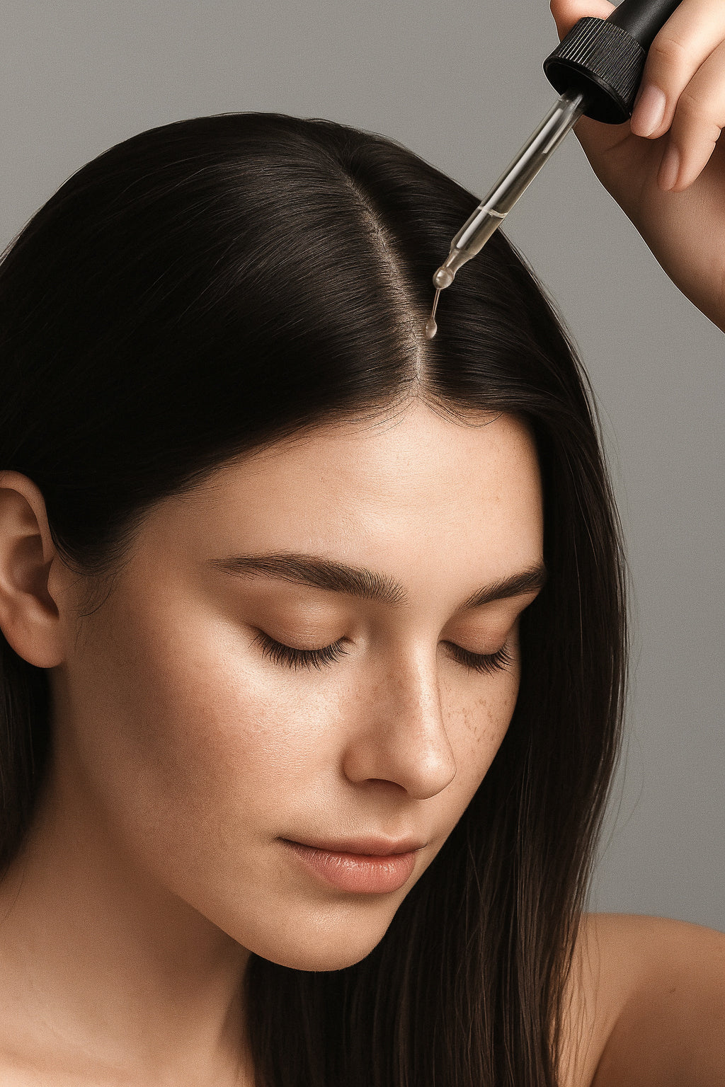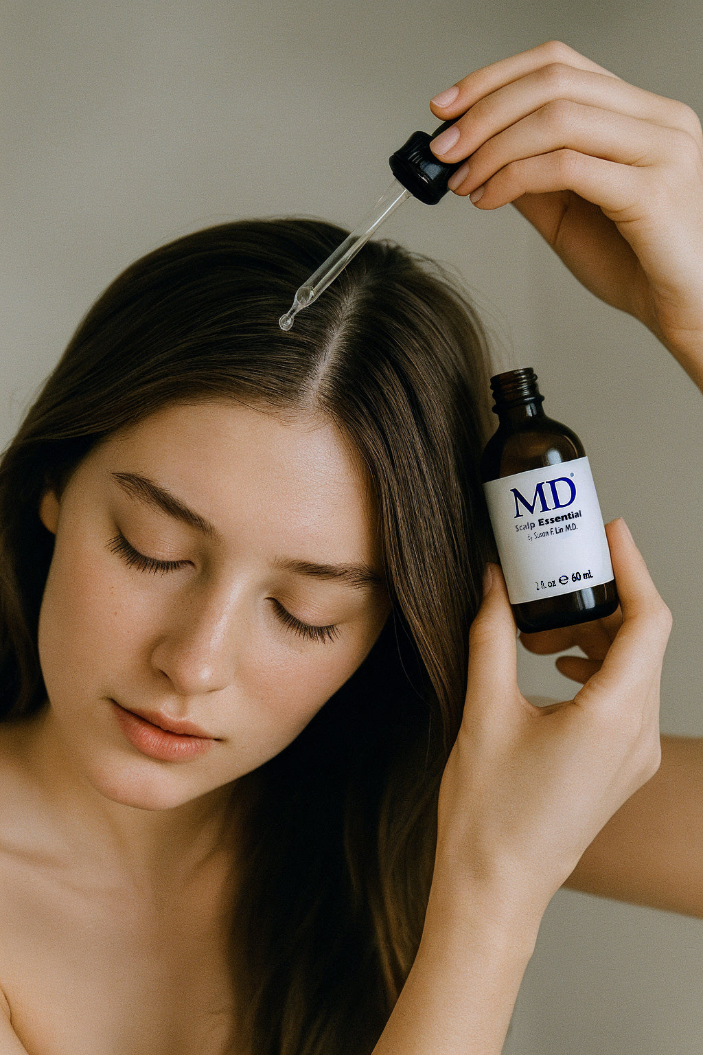 Part hair and apply a few drops of MD Scalp Essential directly onto your scalp,focusing on areas with itchiness, buildup, thinning, or excess oil.